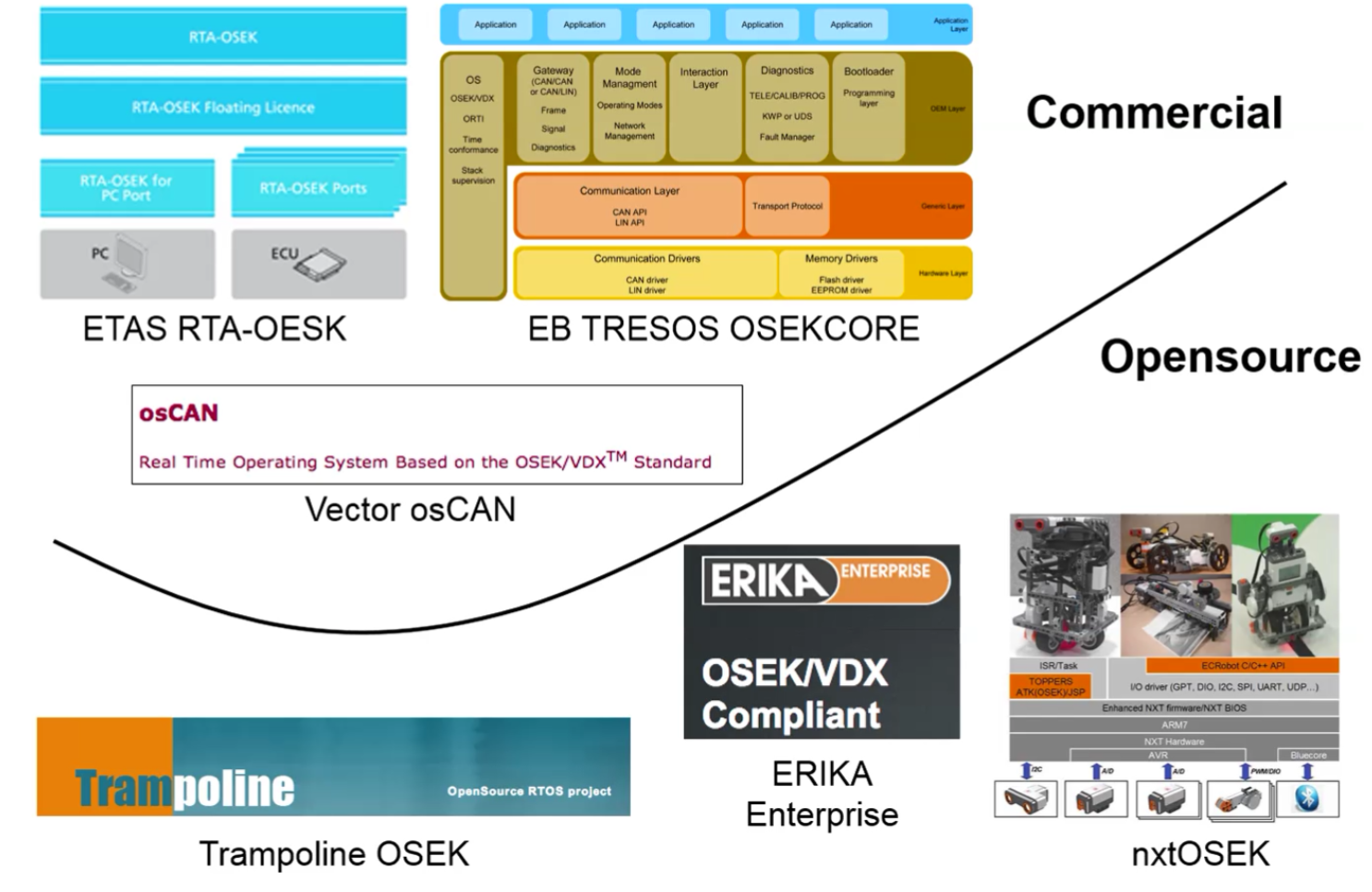 OSEK의 구현물은 ETAS RTA-OSEK, EB TRESOS OSEKCORE, Vector osCAN와 같이 상업용인 경우도 있고 Erika enterprise, Trampoline OSEK, nxtOSEK와 같이 오픈소스인 경우도 있습니다. OSEK Implementation에 대한 정보는 OSEK-WIKI에서 확인할 수 있습니다. 자동차에 탑재되는 건 대부분 상업용 제품이고 연구실 실험에서는 오픈소스를 많이 사용합니다. 자동차 제조 업체나 협력업체에서는 OSEK을 직접 개발하는 경우보다 이미 개발된 OSEK을 구매하여 필요에 맞게 변형하여 사용하는 것이 일반적입니다.