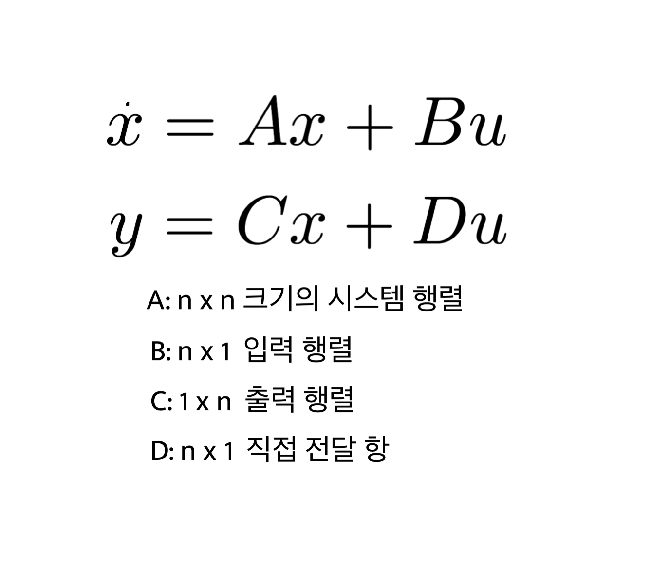 제어에서 상태 공간 표현식(State Space representation)이란 물리적 계를 입력, 출력, 상태 변수의 1차 미분 방정식으로 표현하는 수학적 모델입니다.