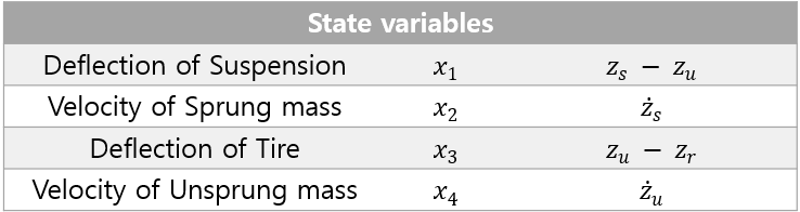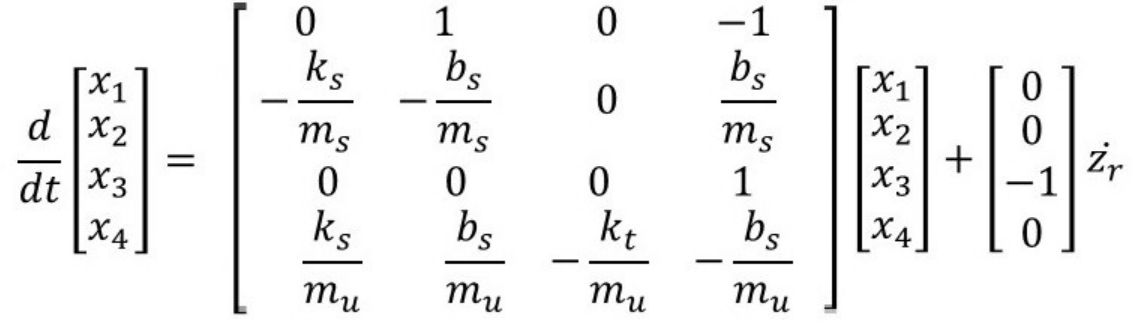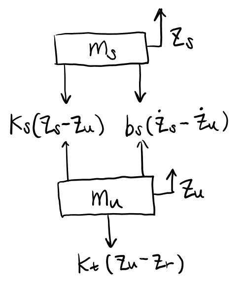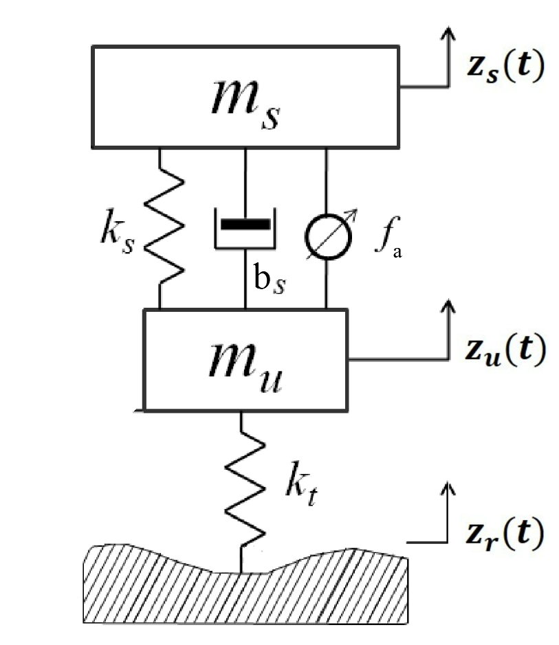 sprung mass는 사람이 타고 있는 윗부분을 말하고 unsprung mass는 그 아래 하부 차체 구조 등을 말한다. sprung은 spring의 과거 분사로 sprung mass하면 위 아래로 많이 왔다 갔다하는 mass라 생각하면 된다. ms의 질량을 가지는 sprung mass와 탄성 계수 ks를 가지는 스프링과 감쇠 상수 bs를 가지는 댐퍼로 현가 장치가 구성된다. mu의 질량을 가지는 unsprung mass는 현가장치와 타이어 사이에 위치하고 타이어는 탄성 계수 kt를 가지는 스프링으로 표현된다. unsprung mass와 도로(road)의 시간에 따른 수직 변위는 각각 zu(t)와 zr(t)로 표현된다. fa는 제어기에서 원하는 성능을 내기 위해 힘을 가하는 것을 의미하며 active 제어기가 없는 경우 0이 된다.