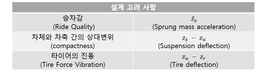 다음의 설계 사양을 고려한다. 승차감은 수직 방향 가속도와 관계가 있으며 이를 최소화하는 게 좋다. 현가 장치의 변형을 최소화하는 것은 차의 compactness와 관련이 있으며 연비에 영향을 줄 수 있다.