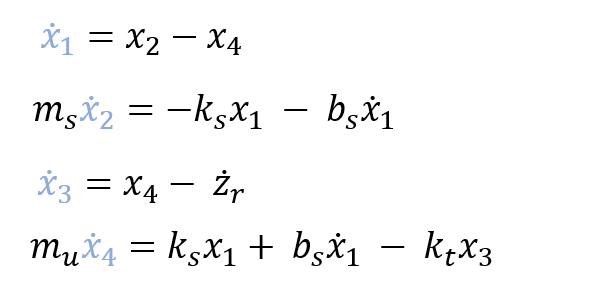 항을 전개하지 않고 x1-x4의 상태 변수를 다음과 같이 정의한다. 우리가 관심있는 변수는 상태 변수에 해당하는 변수다.