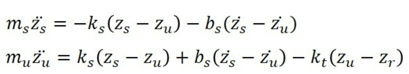 2자유도 1/4-Car Model을 활용해 차체의 수직 방향 운동을 방정식으로 나타낼 수 있다. sprung mass와 unsprung mass가 받는 힘을 고려하여 방정식을 완성한다.