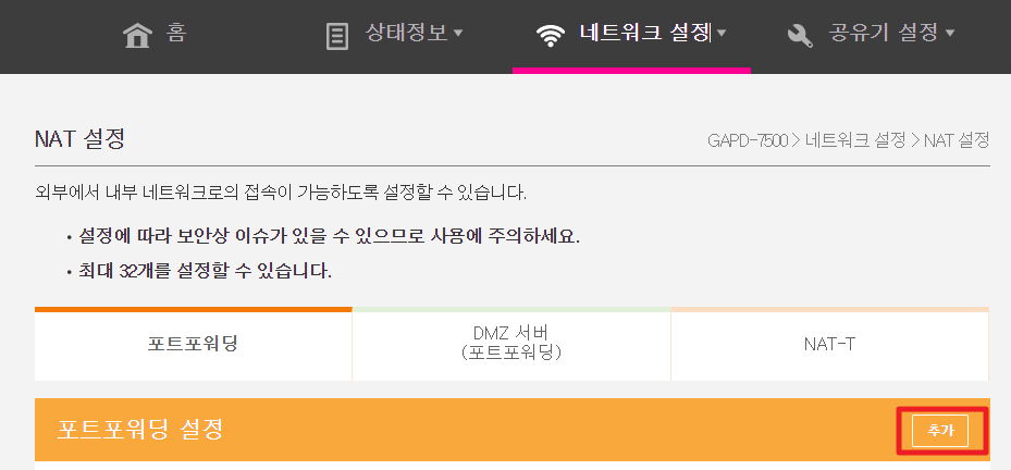 추가를 누르고 설정적용을 누르면 포트포워딩이 적용됩니다.
