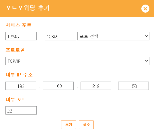 네트워크 설정 - NAT 설정 - 포트포워딩에 들어가 추가를 눌렀습니다. 포트포워딩을 추가하는 창이 뜹니다.