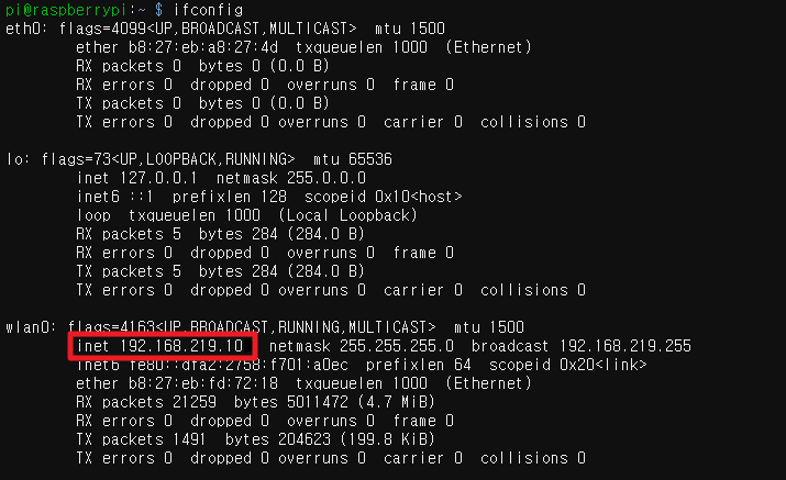 라즈베리파이 터미널에 ifconfig를 입력해봅니다.