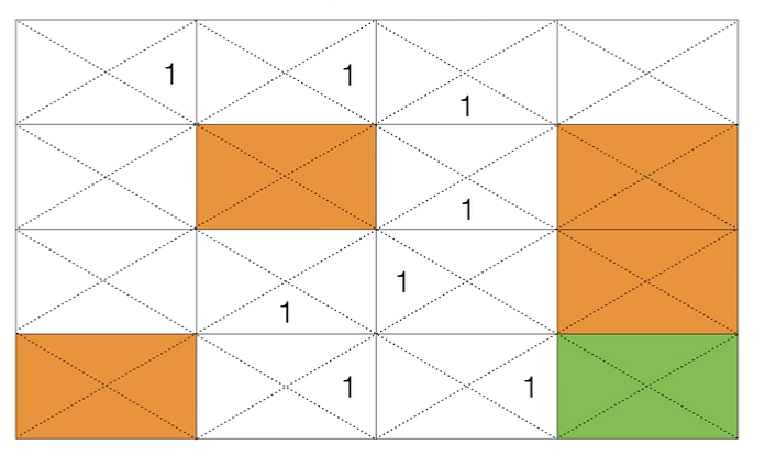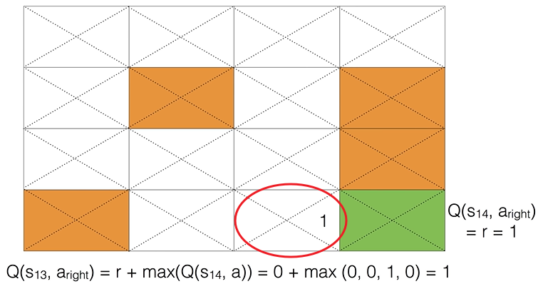 위의 수식으로 Q를 업데이트해도 대부분의 경우 Q 값은 계속 0입니다. 그러다 Q가 업데이트되는 순간이 있습니다. 에이전트가 목적지에 도달하기 전 상태가 되면 Q 값은 업데이트됩니다. (아래 그림에서 빨간 동그라미) 목적지에 도달하면 보상 r = 1이므로 빨간색 동그라미 상태에서 오른쪽으로 가려는 액션을 취할려고 하면 Q 값은 1로 업데이트 됩니다.