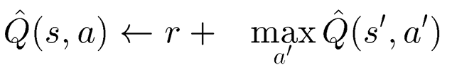 <-는 대입하는 걸 의미합니다. s 상태에서 a 액션을 취했을 때의 Q 값은 a 액션을 취했을 때의 보상 r + s' 상태에서 액션을 취했을 때 얻을 수 있는 최대 Q 값으로 얻는 것입니다.