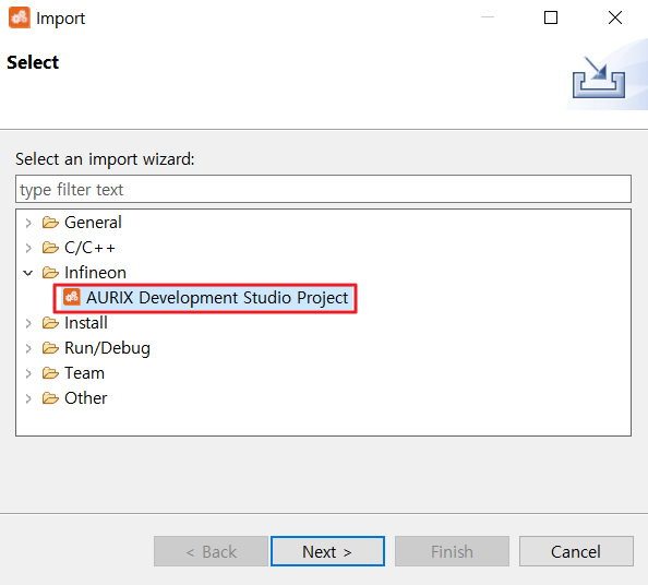FIle - Import를 누르고 Import 창이 뜨면 AURIX Development Studio Project를 선택하고 Next를 누릅니다.